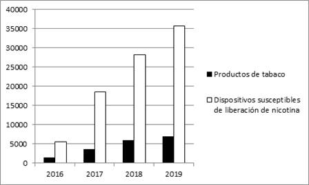 En cuanto a los productos relacionados con el tabaco, es muy llamativa la diferencia en el número de registros entre los dispositivos susceptibles de la liberación de nicotina frente a los de los productos de tabaco. Esto hace pensar que, al contrario que el mercado del tabaco, la comercialización de los cigarrillos electrónicos es relativamente reciente y el mercado es aún emergente. El número de fabricantes e importadores refuerza esta teoría. En cuanto a productos de tabaco, apenas 6 grandes multinacionales copan la gran mayoría de los registros, mientras que en el caso de los dispositivos el mercado es mucho más heterogéneo. Todo ello plantea numerosos retos para su control, como la capacidad de las administraciones para supervisar un mercado de tal magnitud, el cual requiere de la especialización, los medios y la coordinación adecuados. Un ejemplo sería la alerta de salud pública relacionada con los líquidos de cigarrillos electrónicos publicada recientemente9. Así mismo, preocupa el papel de estos productos en la desnormalización del consumo de tabaco y como una potencial puerta de entrada al consumo en los adolescentes. Así, un 20,1% de los estudiantes de secundaria habían utilizado alguna vez cigarrillos electrónicos en España10. Además, actualmente están apareciendo distintas marcas de DSLN como “Juul” o “Blu”, que muestran un aspecto más tecnológico y juvenil, y que han generado especial atención por su consumo en adolescentes12,13. Además, estos productos pueden contener sabores, a diferencia de los cigarrillos convencionales y de la picadura de tabaco para liar, en los que la TPD prohíbe los sabores característicos por su potencial orientación hacia los jóvenes. Diversos países han presentado un aumento del uso de DSLN en los jóvenes, con lo que la prevalencia global del consumo de productos de tabaco y de nuevas formas de consumo se estaría incrementando especialmente en este grupo11.