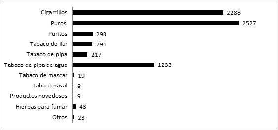 En cuanto a los tipos de productos de tabaco, los cigarrillos y los puros son los más representados.