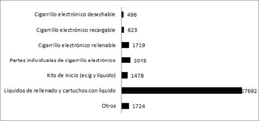 En cuanto a los dispositivos susceptibles de la liberación de nicotina (figura 3), solo los líquidos de recarga y los cartuchos con líquido representaban el 77% de los registros, así como el 64,8% de todos los registros que existían a fecha del estudio para el portal EU-CEG en España.