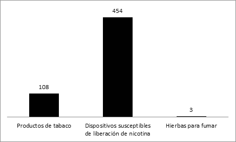 Los 6.959 registros de productos de tabaco se distribuían en 11 categorías distintas (figura 2). El 69,1% de estos registros se repartían entre cigarrillos y puros. Los productos a base de hierbas para fumar suponían solo 43 registros.