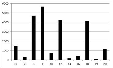 Entre los líquidos de recarga de los dispositivos susceptibles de la liberación de nicotina, existían distintas concentraciones de esta sustancia. En la figura 5 se comprueba que existían 4 concentraciones de nicotina preferentes, las cuales eran de 3, 6, 12 y 18 mg. Estas 4 concentraciones copaban el 67,9% de este tipo de registros.