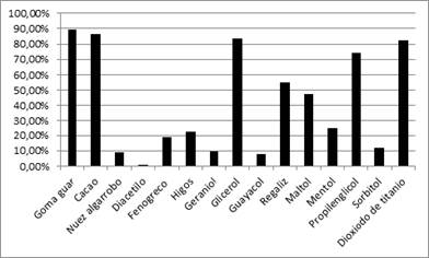 Analizando la presencia de ingredientes prioritarios (figura 6), vimos que 5 ingredientes (cacao, goma guar, glicerol, propilen glicol y dióxido de titanio) estaban presentes en más del 75% de los cigarrillos y el tabaco de liar que había registrados en el portal EU-CEG para España. Es de destacar también el diacetilo, que aparecía en el 1,08% de este tipo de productos.