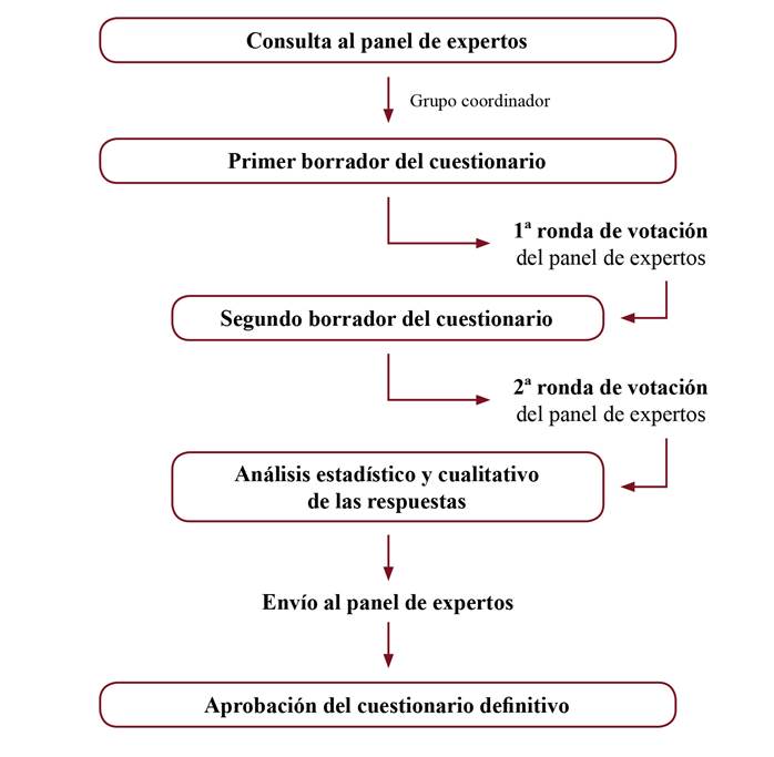 En primer lugar, el panel de expertos recibió un correo electrónico con la invitación a participar y la explicación de los objetivos del estudio. En el mismo, se explicó en qué consistía el método Delphi y los detalles de su participación. El grupo coordinador elaboró un borrador con las primeras aportaciones del panel de expertos y la revisión de la bibliografía. Posteriormente, se realizó la votación de los expertos de forma virtual, puntuando cada categoría o ítem según una escala de tipo Likert (donde 1 significó poco importante y 5 muy importante), según la pertinencia que encontraran en la inclusión de ese ítem en el cuestionario final. También se incluyó un apartado de “observaciones” para que los expertos realizaran sugerencias o correcciones a las categorías propuestas. Se realizó después una segunda ronda de votaciones, también de forma virtual y con la misma escala de puntuación, incluyendo nuevas modificaciones propuestas por el panel de expertos. Se les otorgó un plazo de 14 días tras cada ronda para emitir sus respuestas. En la figura 1 se resume el proceso llevado a cabo para la elaboración y validación del cuestionario.