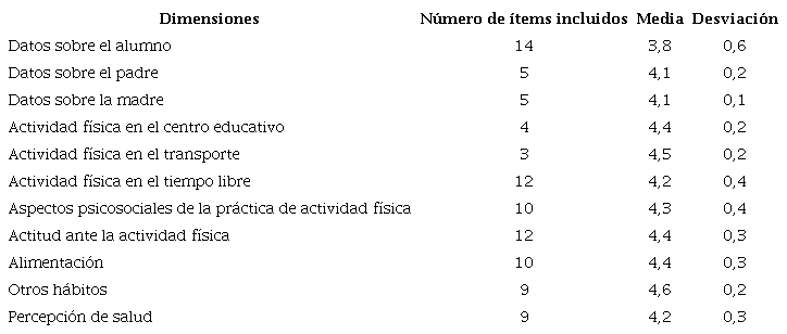 Resultados: Aceptaron participar 21 expertos. Su participación fue del 100% en la primera ronda y del 95,2% en la segunda. Siete ítems incumplieron los criterios. El cuestionario final contó con 93 preguntas y 11 dimensiones: datos sobre el alumno, el padre, la madre, la actividad física en el centro educativo, en el transporte y en el tiempo libre, sobre los aspectos psicosociales de la práctica de actividad física, la actitud ante la actividad física, la alimentación y otros hábitos, y sobre la percepción de salud. Se obtuvo un alfa de Cronbach de 0,974.