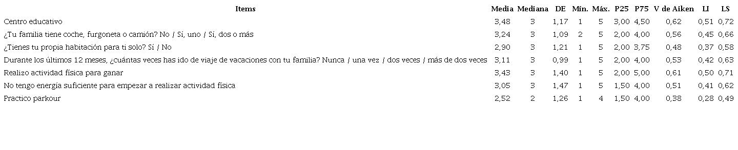 Los ítems que no cumplieron los criterios de selección tras el análisis estadístico de las respuestas del panel de expertos se presentan en la tabla 2. Los cuatro primeros ítems pertenecen a la dimensión “datos sobre el alumno”. La subcategoría “parkour” se valoró dentro de las “actividades deportivas practicadas” en la dimensión “actividad física en el tiempo libre”. Los siete ítems presentaron una media menor de 3,5 y un resultado de la prueba V de Aiken menor de 0,7.