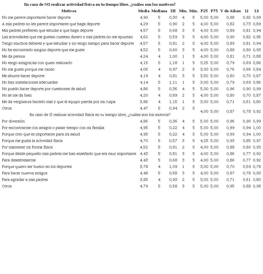Los resultados referentes a las preguntas sobre los motivos para realizar o no realizar actividad física en el tiempo libre, englobadas en la dimensión “actitud ante la actividad física”, se presentan en la tabla 3. Todas las posibles respuestas al ítem contaron con un promedio mayor de 3,5 y un resultado de la prueba V de Aiken mayor de 0,7. Las respuestas mejor valoradas en los motivos para no realizar actividad física fueron “no me parece importante hacer deporte” y “no puedo hacer deporte por cuestiones de salud”, mientras que en los motivos para realizarla lo fueron “por encontrarme con amigos o pasar tiempo con mi familia”, “porque creo que es importante para mi salud” y “por diversión”. De estas posibles respuestas se eliminaron “realizo actividad física para ganar” y “no tengo energía suficiente para realizar actividad física”, como se refleja en la tabla 2.