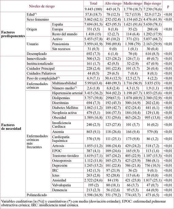 Se identificaron 9.443 pacientes crónicos mayores de 18 años (52,1%), de los cuales 443 (4,7%) eran de alto riesgo, 1.770 (18,7%) eran de medio riesgo y 7.230 (76,6%) eran de bajo riesgo. La edad media fue de 57,8 años y el 62,1% fueron mujeres. Hubo un 81,5% de nacidos en España, con un 57,7% de trabajadores activos y un 7,3% en situación de desempleo. Los de alto riesgo, comparados con los de medio y bajo riesgo tenían una edad media mayor (78 años; 72,7 años; 52,9 años, respectivamente), había un menor porcentaje de mujeres (52,4%; 65,2%; 61,9%, respectivamente), un mayor porcentaje de españoles (95,5%; 91,6%; 78,1%, respectivamente), un mayor porcentaje de pensionistas (89,8%, 79%; 29,9%, respectivamente), un mayor número de enfermedades crónicas (6,8; 4,3; 1,9; respectivamente) y mayor polimedicación (79,2%; 43,7%; 6,2%; respectivamente), siendo estos resultados estadísticamente significativos. Las enfermedades crónicas más frecuentes dentro del alto riesgo fueron hipertensión arterial (82,2%), dislipemias (67,5%), disrritmias (43,3%), diabetes (42,7%), neoplasias (37,5%), obesidad (29,6%) e insuficiencia cardiaca (27,8%) (tabla 1).