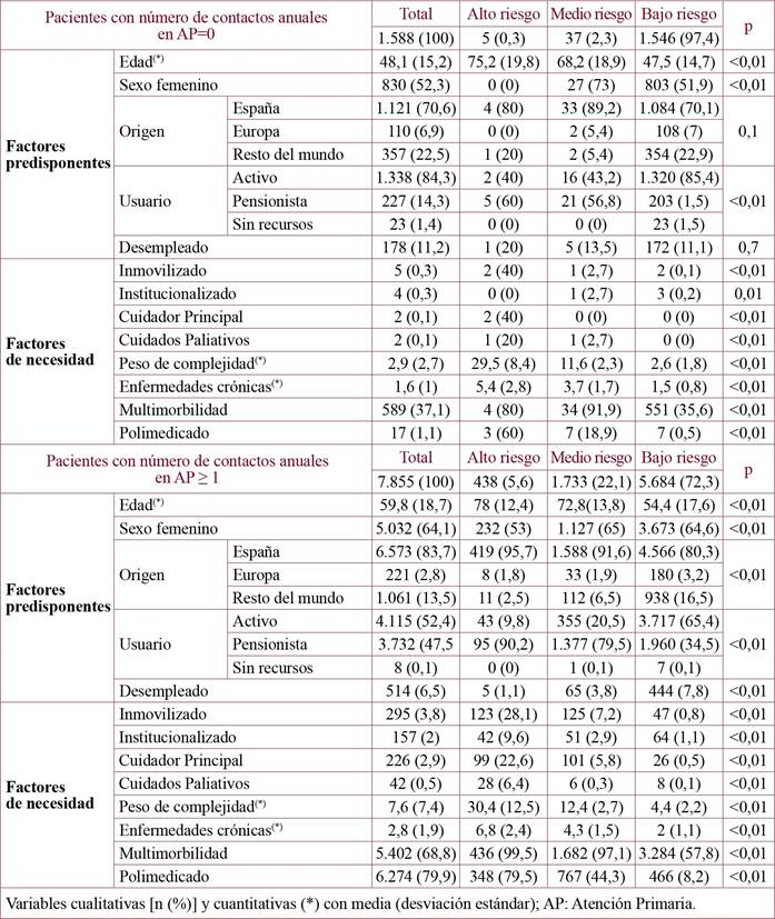 Results: 9,443 chronic patients (52.1% of the population in the selected zone) were identified, mean age of 57.8 (SD=18.7); 62.1% women. According to their risk level 4.7% were high risk, 18.7% medium risk and 76.6% low risk. The mean number of contacts per year was 14.1 (SD=15.2); 34.4 (SD=27.9) in high risk; 21.8 (SD=17.2) in medium risk and 10.1 (SD=10.2) in low risk. 7.5 (SD=7.1) contacts were with the doctor and 12.9 (SD=12.9) were face-to-face. The factors associated with higher use of services were high risk (Coefficient B(CB)=12.6; IC95%=11-14.2), immobilization (CB=8.8; IC95%=7.3-10.4), polypharmacy (CB=6; IC95%=5-8.6), female sex (CB=1; IC95%=0.4-1.5), number of chronic diseases (CB=1; IC95%=0.8-1.2) and age (CB=0.03; IC95%=0.01-0.05).