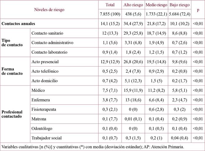 De los 7.855 pacientes que utilizaron AP, la media de contactos anuales fue de 14,1, siendo superior en crónicos de alto riesgo frente a la media de medio y bajo riesgo (34,4; 21,8; 10,1; respectivamente). El tipo de contacto más frecuente fue el sanitario, con una media de 12 contactos, siendo superior en alto riesgo frente a la media de medio y bajo riesgo (26,8; 19,5; 9,8; respectivamente). La forma de contacto fue fundamentalmente presencial (12,9 contactos) y mayor en crónicos de alto riesgo frente a los de medio y bajo (26,8; 19,5; 9,8; respectivamente). El profesional más contactado fue el médico de familia, con una media de 7,5 visitas (seguido del de enfermería con 3,8 visitas), siendo mayor en crónicos de alto riesgo (15,9 frente a 13) respecto a medio riesgo (11,2 frente a 6,6) y bajo riesgo (5,8 frente a 2,3). La media de contactos con el trabajador social fue de 0,1, siendo mayor en alto riesgo respecto a medio y bajo riesgo (0,3; 0,2 y 0,1; respectivamente). Estas diferencias fueron estadísticamente significativas (tabla 3).