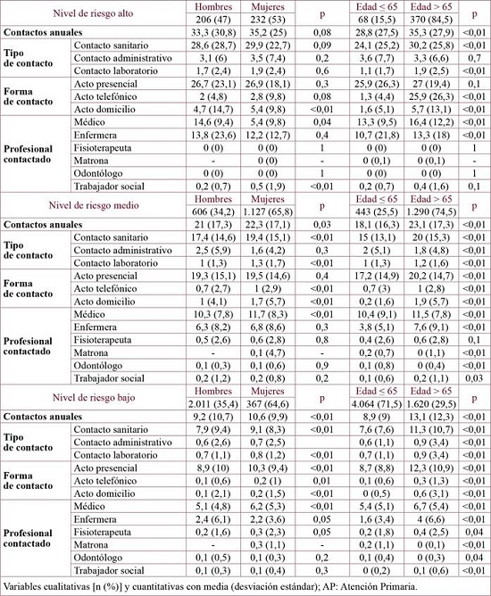 Respecto a la utilización de los servicios por sexo y edad según el nivel de riesgo, las mujeres tuvieron una media de contactos anuales con AP mayor que los hombres en todos los niveles de riesgo (35,2 frente a 33,3 en alto; 22,3 frente a 21 en medio; 10,6 frente a 9,2 en bajo), siendo esta diferencia significativa en medio y bajo riesgo. Esto sucedió también en todos los tipos, formas de contacto y profesionales contactados, excepto en las visitas a la consulta de enfermería, que fueron superiores en los hombres de alto y bajo riesgo y en los contactos administrativos en los hombres de medio riesgo, sin ser estos resultados estadísticamente significativos (tabla 4).