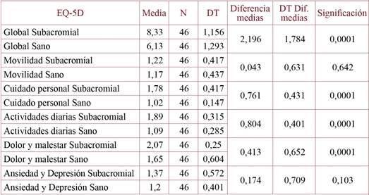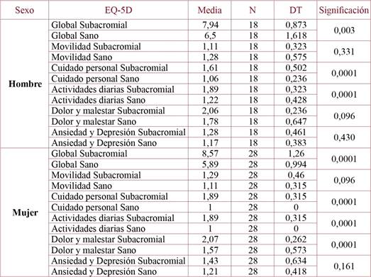 Se evaluaron las diferencias hombre-mujer intragrupo (subacromial y asintomático), no objetivándose diferencias significativas en el EQ-5D global entre sexos en ninguna de las poblaciones a estudio (p>0,05), excepto en la dimensión de cuidado personal en los sujetos con síndrome subacromial (p=0,033) y en la dimensión de actividades diarias en el grupo asintomático (p=0,019). En ambos casos eran los hombres los que refirieron una peor calidad de vida. Por otro lado, en el análisis entre grupos según sexo, se obtuvieron diferencias estadísticamente significativas en el EQ-5D (global, cuidado personal, actividades de la vida diaria), tanto en hombres como en mujeres (p<0,05), mientras que en el subapartado dolor y malestar solo se obtuvo una peor calidad de vida en mujeres (tabla 2).