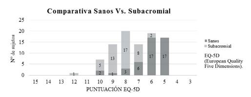 Results: The EQ-5D questionnaire obtained a standardized mean of 0.70 in the subacromial syndrome and 0.85 in the asymptomatic population (P=0,0001). The prevalence of impingement subacromial within shoulder pathology was 39.19%.