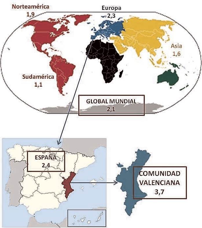 Más en concreto, los autores firmantes del presente estudio publicaron otro en el año 20173 donde se probó la importancia relativa de la FM en la Comunidad Valenciana en relación con diferentes latitudes territoriales, con una prevalencia en diciembre de 2016 del 3,7 por ciento de la población total, superior a las medias obtenidas para el resto del mundo, los diferentes continentes y España (figura 1).