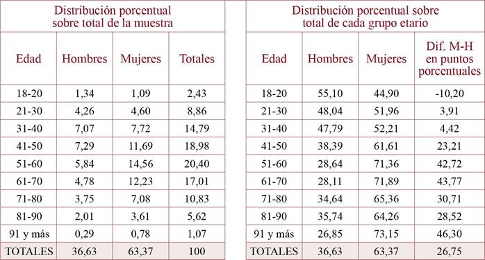 Fue destacable que los grupos etarios más jóvenes, hasta los 30 años, mantuvieron una notoria homogeneidad entre sexos, con un porcentaje incluso mayor de hombres que de mujeres en el rango de los más jóvenes. Sin embargo, a medida que la muestra avanzaba en edad, sobre todo a partir de los 40 años, las mujeres adquirían una representatividad sobresaliente que fue especialmente significativa entre los 51 y los 70 años, con distancias entre sexos de más de 40 puntos porcentuales de las mujeres por encima de los hombres (tabla 1).