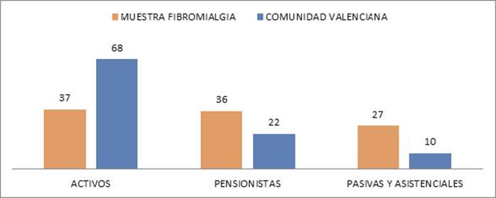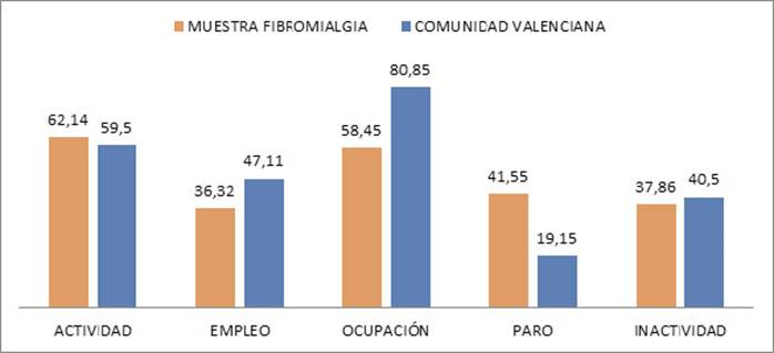Los pacientes de FM sufrían dificultades laborales de gran impacto. La tasa de paro fue muy alta (más del 41%), duplicando la de la Comunidad Valenciana (según la Encuesta de población activa del cuarto trimestre de 2016 del Instituto Nacional de Estadística). Este elemento es especialmente grave si tenemos en cuenta la baja tasa de empleo, que actúa, como sabemos, de catalizador interpretativo de la gravedad relativa de la tasa de paro, y que se ubicó en el 36%, más de 10 puntos por debajo de la tasa autonómica (figura 4).