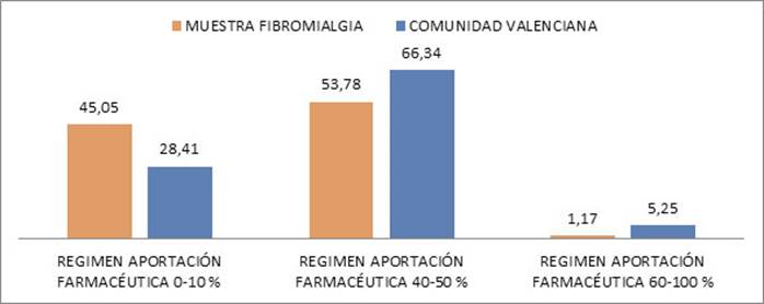 Los niveles de renta, observados de acuerdo con el régimen de aportación farmacéutica y en relación con el total poblacional de la Comunidad Valenciana, eran más bajos entre la población con FM. Los pacientes con el nivel más bajo de renta (aportaciones del 0 a 10%) supusieron el 45% de la muestra, mientras que en la población general de la Comunidad Valenciana los sujetos con tales aportaciones se ubicaron en el 28% (figura 5).