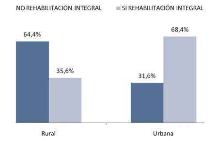 El lugar de residencia se evidenció como un factor claramente asociado a la rehabilitación integral (p=0,001), que condicionaba fuertemente el acceso a la misma, tal como muestra la figura 1. La gran mayoría de los pacientes que accedieron a rehabilitación integral vivían en zona urbana (exactamente un 68,4%), y la mayoría de quienes vivían en zona rural no accedieron a la misma (un 64,4%).