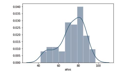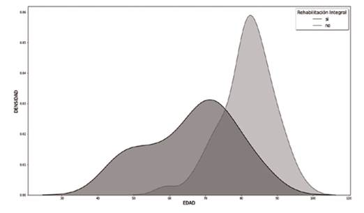 Como se evidencia en la figura 2, la edad se mostró como un factor muy claramente asociado a la posibilidad de recibir rehabilitación integral, ya que a mayor edad se reducían considerable y muy significativamente las posibilidades de acceso a una rehabilitación integral (p<0,0001). La edad media de quienes accedieron a la rehabilitación integral era de 66,2 años, y la de quienes no accedieron era de 81,7 años. Si comparamos las medias de edad entre quienes recibieron o no rehabilitación integral, tanto el test t-student (p<0,0001) como el test Mann-Whitney U (p<0,001) arrojaron la misma conclusión. La única variable numérica de interés resultó ser la edad. Se aplicaron tres tests de normalidad a dicha variable (Anderson, Kolmogorov-Smirnov y Saphiro-Wilk). Según el test de Saphiro-Wilk, la distribución no era normal, mientras que según el test de Kolmogorov-Smirnov y el test de Anderson sí que era normal. Observando el gráfico de distribución de la edad de la figura 3, vemos una distribución que se aproximaba a la normal, mientras que si se analizan los gráficos q-q, la distribución no parecía normal. Por estos motivos, se realizaron los tests paramétricos y no-paramétricos. Los tests de normalidad se tendrán que volver a repetir en caso de replicar el análisis con más datos o datos diferentes.