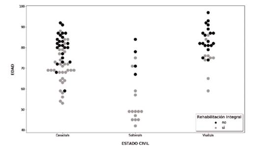El estado civil fue el tercer factor que presentó diferencias significativas en el acceso a la rehabilitación integral (p=0,008), siendo mayor el porcentaje de personas solteras que la lograban (77,8%), frente un 57,1% de casadas y un 32,1% de viudas. Ahora bien, analizando conjuntamente la edad y el estado civil (figura 3), y considerando que la edad media de las personas viudas era de 81,4 años, la de las casadas de 74,4 años y la de las solteras de 57,3 años, para determinar si el estado civil podría ser un factor de confusión al estar en sí mismo correlacionado con la edad, se realizó tanto un test ANOVA como un Kruskal-Wallis, para evaluar la diferencia de medias de edad entre los tres grupos. Ambos fueron significativos (p<0,0001), por lo que podemos concluir que era un factor de confusión altamente correlacionado con la edad (ver figura 4).