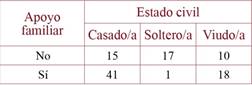 La existencia de apoyo familiar también estaba significativamente asociada al estado civil (p=0,007), siendo las personas viudas quienes tenían menos posibilidades de acceso a la rehabilitación integral, seguido de las personas casadas (ver tabla 3).