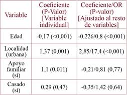 Como se muestra en la tabla 1, fueron cuatro los factores asociados al acceso a la rehabilitación integral: el lugar de residencia (medio rural/medio urbano), el estado civil, la edad y la existencia de apoyo familiar. Otros factores, como los ingresos económicos o el sexo, no presentaron asociación significativa.