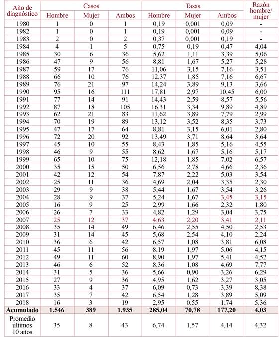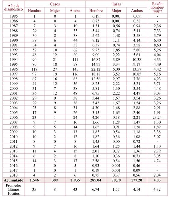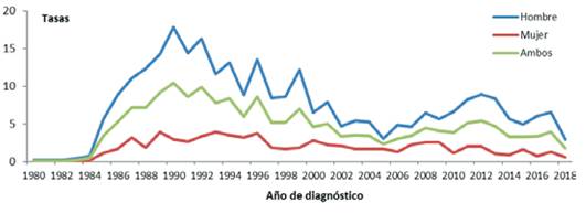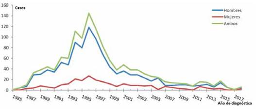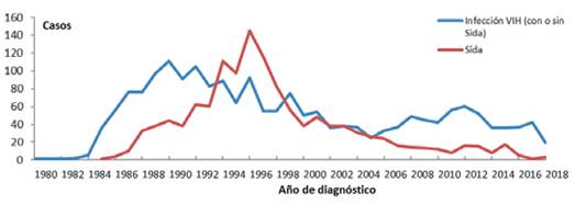 Results: By the end of 2018 the consolidated HIV-AIDS epidemiological surveillance system had registered 3,039 cases, which 1,954 cases were considered incidents. In the nineties the highest incidents rates per hundred thousand inhabitants of HIV infection (10.45 in 1990) and AIDS (13.57 in 1996) were reached, decreasing continuously from 2000, being in this year of 4.66 for HIV infection and 3.54 in AIDS. The cumulative incidence of the period was four times higher in men compared to women. The average age at diagnosis increased in recent years in HIV infection (27.80 years in 1990 compared to 37.32 years in 2018) and in AIDS disease (30 years in 1990 compared to 36 years in 2018). A parallel evolution of the diagnoses of HIV infection and of AIDS was observed, with a lag of 4 years coinciding with the beginning of the series, reducing since 2005 by approximately half the diagnoses of AIDS.
