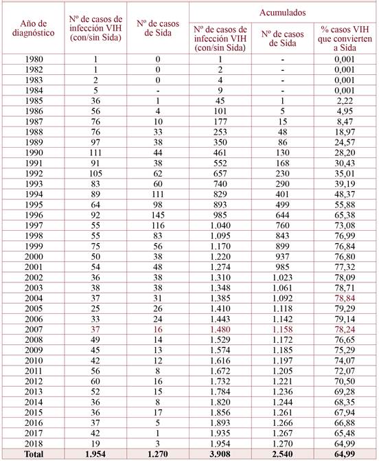Resultados: A 31 de diciembre de 2018, el sistema unificado de vigilancia de infección VIH-Sida registraba 3.039 casos, de los cuales 1.954 se consideraron incidentes. En la década de los 90 se alcanzaron las mayores tasas de incidencias por cada cien mil habitantes de infección por VIH (10,45 en 1990) y en enfermedad de Sida (13,57 en 1996), disminuyendo de manera continua a partir del 2000, siendo en este año de 4,66 para infección por VIH y de 3,54 en SIDA. La incidencia acumulada del período fue cuatro veces superior en hombres respecto a mujeres. La edad media al diagnóstico aumentó en los últimos años en infección por VIH (27,80 años en 1990 frente a 37,32 años en 2018) y en enfermedad de Sida (30 años en 1990 frente a 36 años en 2018). Se observó una evolución paralela de los diagnósticos de infección por VIH y de Sida, con un desfase de 4 años coincidiendo con el inicio de la serie, disminuyendo a partir del año 2005 los diagnósticos de Sida aproximadamente a la mitad.