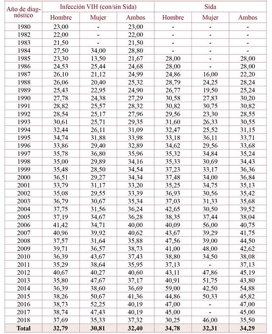 Una realidad de la infección por VIH es el aumento de la edad media al momento del diagnóstico de los pacientes, desde el momento álgido de la epidemia en los años 90 a la actualidad (27,80 años en el año 1990 frente a 37,32 años en 2018), así como en el de la enfermedad de Sida (30 años en el año 1990 frente a 36 años en 2018). Este aumento en la media de edad de los casos de VIH y Sida también se observa a nivel nacional9,10, tal vez relacionado con el cambio el patrón de transmisión.