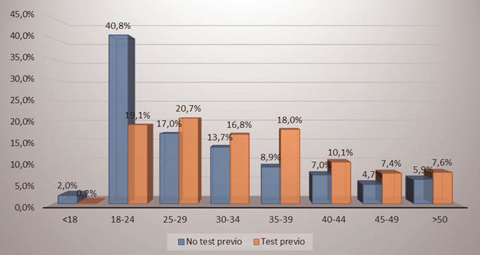 Un 61,9% tenían una prueba previa de VIH, en mayor proporción en el grupo de edad de 25 a 29 años (20,7%) (figura 6). La prueba previa también fue más frecuente entre los hombres que entre las mujeres en todas las edades.
