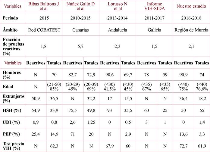 El perfil de la población usuaria del PDPVIH de la Región de Murcia corresponde a hombres de origen español, menores de 40 años, con relaciones sexuales tanto heterosexuales como homosexuales, y con la realización de una prueba rápida en los 12 meses previos a la práctica de riesgo. Estos resultados están en consonancia con los obtenidos en otros estudios similares desarrollados en diferentes comunidades autónomas (CCAA)13,14,15 y en los proyectos comunitarios de prueba del Plan Nacional del Sida (PND)16, con poblaciones destinatarias similares a la de nuestro programa (tabla 1).