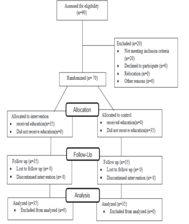 The inclusion criteria to this study were having no history of hospitalization of the child, patients with bilateral sensorineural hearing loss, being the first child, being at the age of 1-3 years old, mothers having no psychological problems, and mothers not participating in the training sessions about this problem of the child. The exclusion criterion of the study was the mother's reluctance to continue cooperation and participation in the study. The participants of two groups were blinded to random allocation and Participants have no information about random allocation. 70 mothers who had the inclusion criteria were entered in the study. Then, they were placed in one of the control or intervention groups with random assignment using RA software, block random allocation with the block size of 4 and there were 18 four blocks samples, after that 70 persons were selected and they were investigated and tracked within two months from the time of admission until the next visit to the ear clinic. None of the samples were excluded from the study until the end of the study. (Figure 1) shows the information of the mothers participating in this study.