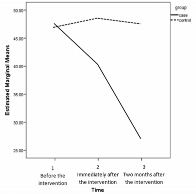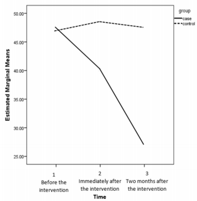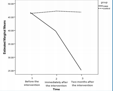 As shown in (Table 3), since the interaction between time and group is significant intra- group changes were made in two groups and t-test was used to check the difference between the two groups. There was no significant difference in the mean of apparent anxiety (p=0.77), hidden anxiety (p=0.91) and self-efficacy (p=0.41) of the participants between the control and interventional groups before the study. Moreover, there was a significant decrease in hidden anxiety and apparent anxiety by measuring immediately after the intervention and two months later in the interventional group (p<0.001). There was a significant increase in the level of self-efficacy of mothers, but not in the control group. (p<0.001) (Figure 2).