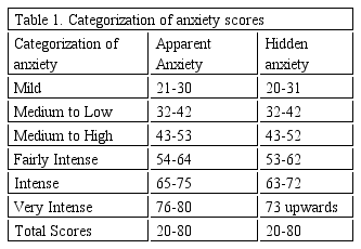 Spielberger State-Trait Inventory questionnaire is used to measure apparent and hidden anxiety, It contains 40 questions and consists of two dimensions of apparent anxiety and hidden anxiety, each of which having 20 questions. Obvious anxiety scale evaluates an individual's emotions at the moment and at the time of responding17. Apparent anxiety is determined by a four degree Likert scale (very low, low, high, very high) and each of the options is given a score of 1 to 4, respectively. The hidden anxiety scale measures ordinary feelings of people most of the time17. Hidden anxiety is determined by a four degree Likert scale (almost never, sometimes, most often, and almost always) and score of 1 to 4, respectively. In this test, the obtainable anxiety score is between 20 and 80. The following (Table 1) describes the categorization of each group of anxiety according to the total score of the questionnaires18.