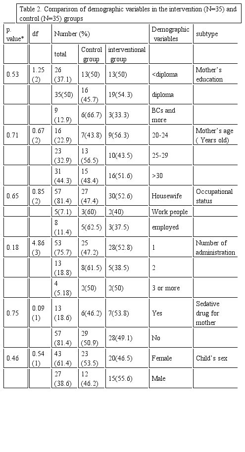 In this study, 70 mothers of children undergoing cochlear implant surgery were examined. (Table 2) shows the demographic characteristics of mothers and children divided into two groups of intervention and control. The mean age of the children in the intervention and control groups was 2.45±0.61 years and 2.47±0.50 years, respectively. In terms of age-match, the result of the independent t-test showed that there was no significant difference between two groups (P=0.92). Based on the results of this study, there was no significant difference between the two interventional and control groups regarding the demographic characteristics of the mother and the child (Table 2).