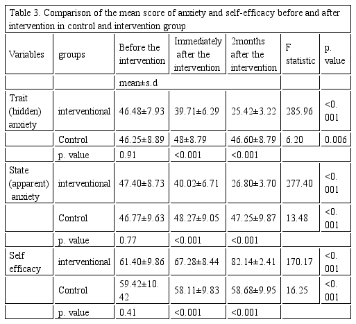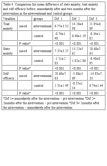 As seen in (Table 4), the difference between the mean of apparent and hidden anxiety and self-efficacy between the two groups of intervention and control, before, immediately after, and two months after the intervention was significant, using the comparison rule of the two independent groups (p<0.001) in (Figure 4).
