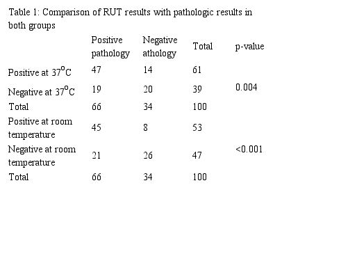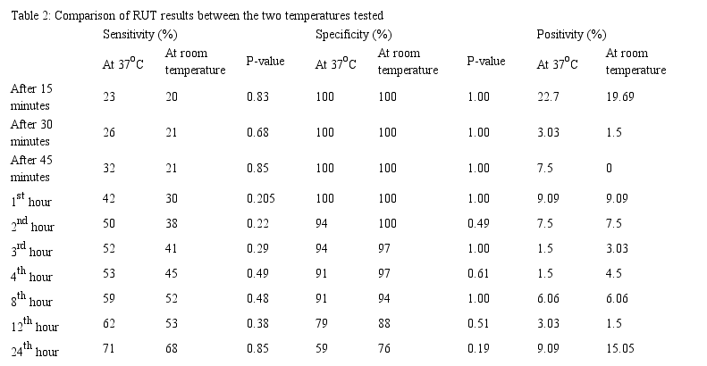 Among all positive RUT results, 26 cases were positive at both temperatures and 23 cases got positive faster at room temperature; the difference was more than one hour in 19 cases and less than one hour in 4 cases; also, 3 cases became positive later at 37oC.