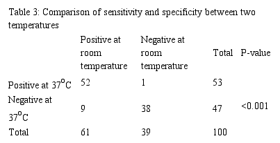 Mean response time at 37.C was 7.69±9.41 hours (median: 2 hours), which was 8.55±9.95 (median: 3 hours) at room temperature (P=0.553).