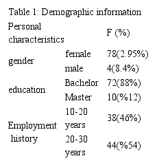 The results of this research conducted on 82 top and middle nursing managers showed that most of the research subjects were women. Their mean employment history is 19.5 years. Most of them have a bachelor level of education and most of them are aged between 20 and 30 years (the relevant content is presented in (Table 1).