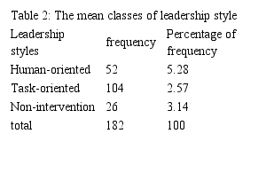 The data showed that most of the subjects had, task-oriented leadership style, followed by human-oriented and then non-intervention styles, respectively (The relevant content is presented in (Table 2).