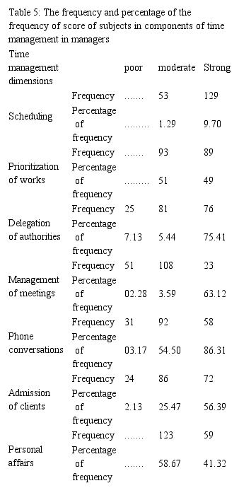 The results of the study in (Table 5) showed that the mean of time management components in top and middle managers was at strong level in the scheduling dimension and at poor level in the dimension of admission of clients.
