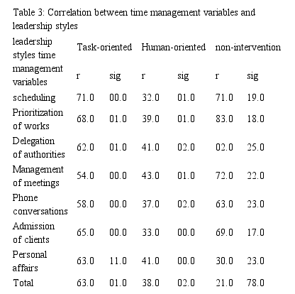 The results of the correlation test of leadership style and time management showed that the task-oriented leadership style at the significance level of 0.05 has the strongest correlation with time management but non-intervention leadership style showed no correlation with time management.