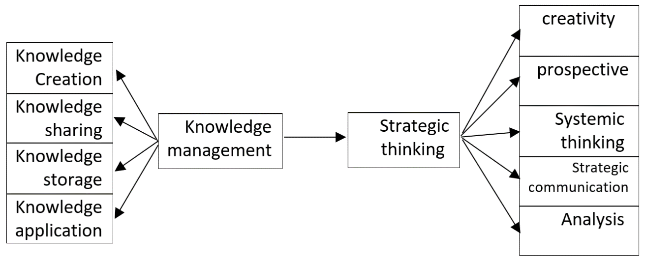 Capability of Interpretation of irrelevant and Unplanned events would be one of the most successful activities of managers in the following organizations that these capabilities are like strategic thinking showing a substantial deficit to reach an organization to their goals. This strategic capability helps the employees to distinguish, realize, anticipate, and control the prospective activities, and instead of being affected changes, they can create future changes which can control them21. In literature of strategic management, there have been many definitions for the conception of strategic thinking; some authors use conception of strategic thinking for other reasons such as strategic planning, strategic management25. Others concentrated on the strategic management process and expressed that a strategic planning would contribute in strategic thinking22 or accepted that a designed strategic management can facilitate a strategic thinking in an organization24. Mintzberg, who believes in clear distinguish between strategic thinking and strategic planning, announces that strategic planning is not a strategic thinking. He, in fact, believes that strategic planning focuses on analysis and it would be considered as interpretation, expansion of details and common strategic configuration. On the other hand, strategic thinking emphases on combination, using intuition and creativity for making a fixed shape of organization, and it proves that a strategic planning seems to be a process that would become from strategic thinking17. Ohmae in his famous book entitled the thinking of a strategist claimed that if you are not able to detect the remarkable subjects, it ends up failing and confusing; even if you put many physical and spiritual pressure on your own and your employees. It has been revealed by Cristina et al at 2014 in their work entitled '' Exploring the role of knowledge management practices on exports: A dynamic capability view'' the ways of knowledge managements affect exports significantly, in a way that to improve exports, existence of knowledge management will be an essential requisite but not a sufficient one11. In this regard, Alexia at 2014 reviewing the theory of knowledge management and prospective directions expressed that efficiency in organizations depends on the capability of managers for making new knowledge, and knowledge would be the key factor in production not machinery. In addition, they confirmed that in a new business atmosphere, profits of a company vastly depend on utilizing the knowledge management processes5. In another research by Gelard in 2014 has been proved that there are strong ties between transformational leadership and all aspects of that with knowledge management13. Moreover, in 2014 Naser showed that knowledge management and its factors affect organizational learning. He confirmed that among all knowledge management mentioned before, the most effective cause on organizational learning would be knowledge contents19. In 2014 Shu-Mei, in a research with the aim of considering the effects of knowledge management and source connected management on the company's functions, concluded that knowledge management can have a big impact on big company achievement23. In another survey, Keng (2014) represented that there is a strong relationship between this two factors strategic planning, human resources management and aspects of knowledge management. They also showed process management can have considerable impacts on the business knowledge and disseminated knowledge16. Angela and their team in their work with the aim of realizing how knowledge management can affect project efficacies revealed that knowledge management on achieving to project management aims would be effective6. Charles and coworkers in 2014 revealed that the more using the knowledge management in an organization increase, the faster that organization would progress9. Gamal at 2014 also showed that knowledge management and its aspects has impacts on operational function. Also, innovative operations can play intermediator role between the knowledge management and operations18.