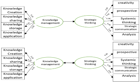 Findings: Structural model: Having assured of validity of measured models (factor analysis of knowledge management conceptions and strategic thinking), the main questions of research was evaluated. In fact, relationships between knowledge management and strategic thinking were estimated that mentioned in the following model.