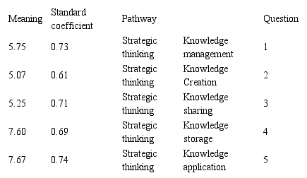 Model fitting: The achieved amounts showed in table.2, demonstrates that the conceptual model of research has a good fitting and the obvious relationships between knowledge management on strategic thinking has been confirmed. As a result, mean square error model is (0.064) which is less than 0.08, and also X2/df is 1.42 which is less than 3; Therefore, model has a good fitting which indicates that planned relationships in accordance with research theoretical framework was logical.