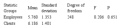 As the data of table 6 indicates, based on the covariance analysis test, there is not significant difference between the attitudes of employees and clients towards emotional intelligence. (p=0.359)