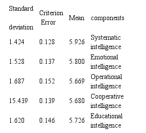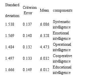 Based on the results of table and figure 2, the highest mean is related to emotional intelligence with the value of 6.638 and the least one is related to operational intelligence with the values of 4.473.