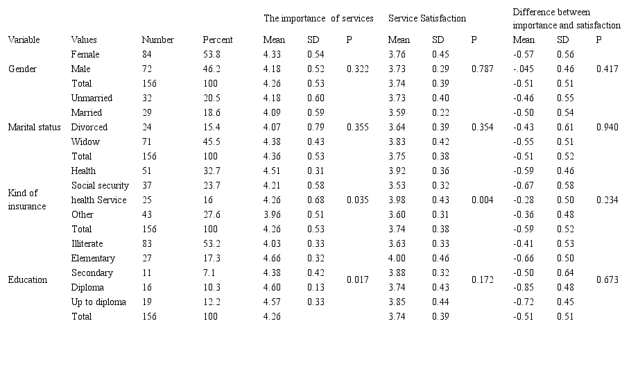 Table 1 shows the results of independent T and ANOVA tests. Only insurance type had a significant effect on the satisfaction of the services provided in the nursing home (P <0.05). Also, the only statistically significant demographic index on the importance of services for the elderly was education (P <0.05). Other demographic variables studied in the elderly were not generally effective in the level of expectation of the elderly and their satisfaction with the provided services. Meanwhile, in the difference of importance and satisfaction (dissatisfaction), none of the demographic variables studied had a significant effect (P <0.05).