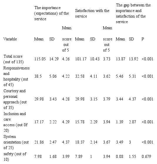 Table 2 shows the results of paired T-test. The mean scores of services that the elderly cares about and expect to be done is 115.05 ± 14.29 (mean of 5 scores = 4.26), while the mean score of service provided in the nursing home to elderly, is 101.17 ± 10.43 (mean of 5 scores = 3.74). The studied elderly gave the most importance among the dimensions of the importance of services to system orientation (4.37 out of 5) and the least of them to safety (3.99 out of 5). Also, the highest mean score of satisfaction of elderly people living in the nursing home, by dimensions related to capacity and access to care and safety, 3.94 out of 5, and the least of them were responses and hospitality, reported 3.62 out of 5. The mean difference between the two variables (13.87 ± 13.92) indicates the gap between the expected services and what is actually provided in the nursing home. The gap is compared with the zero score, and the more difference of score with zero, the greater gap. Most of the gap is related to the responsiveness and hospitality dimensions and the direction of the system respectively. There was no significant difference between importance and satisfaction in safety dimension of the questionnaire (P> 0.05).