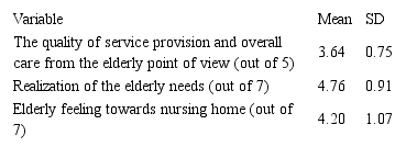 In Table 3, overall satisfaction of services provided by the nursing home was 3.64 ± 0.75 (mean of 5 points). Mean score of satisfying the needs of the elderly from their point of view was 4.76 ± 0.91 (mean of 7) and the feeling of the elderly toward nursing home was 4.20 ± 1.07 (mean of 7 points).