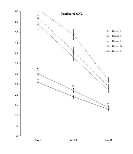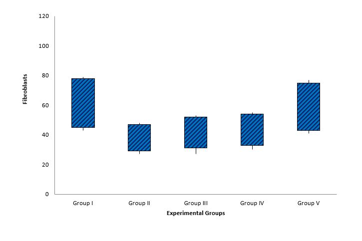Resultados: el estudio microbiológico, planimétrico, histológico y morfométrico cuantitativo y la determinación de los niveles de hidroxiprolina mostraron que había una diferencia significativa entre los animales en el grupo V en comparación con otros grupos (P = 0,001).